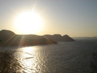 ▲瀬戸内海に夕日が沈む... ▲小槌島(手前)と大槌島(奥側)