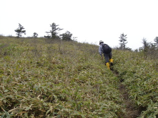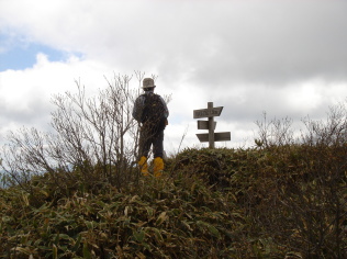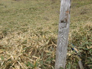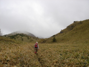 | 沢山、車が停まっていたが殆どの方は矢筈山方面へ行かれたようだ。 私達は逆の烏帽子山・寒峰方面へ向かう。 天気予報では快晴の予報だったのに生憎のガス...おまけに肌寒い^^; ここから見えるハズの烏帽子山もガスの中で残念ながら見えず。 寒峰4.7km方面へ進む。笹原のスロ−プが快適だ。 第一のピ−ク!落ハゲに近づくにつれ勾配が急になり息が切れる.... ふと左手を見ると天狗塚がチョコンと頭を出しているのが見えた! 先月ネット仲間と登ったのが懐かしい〜 |