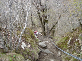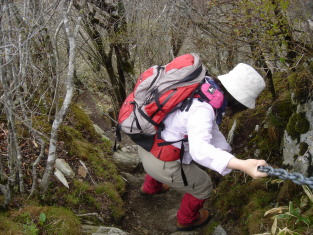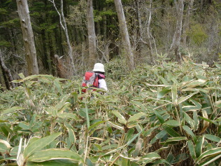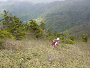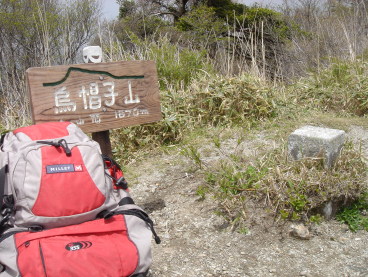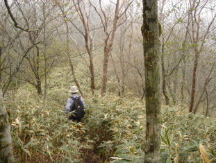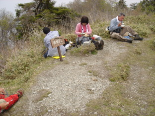 | さぁここからが本日のメインイベント!ウワサのヤブコギだ! ガイドブックや皆さんのHPによると相当手強いらしい.... 覚悟して進むが要所要所に赤テ−プが有り、さして危険な場所も無く無事通過。 ここで初めて下山して来られた単独の方にお会いする。 烏帽子山への最後の急登の場所まで来た!一安心.... 笹を掴みながら急登を頑張って登る。 所々にミツバツツジが咲いており心が和む... 人影が見えて来た! 前烏帽子山から一時間弱で烏帽子山山頂到着! 営林署から登られた4名の方と落合峠から登られた単独の方の先客あり! 360度の展望のハズだがガスで見通しがきかない。 食事をしながらガスが晴れるのを待つ.... |
