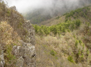 | 食事をしているうちに少しずつガスが晴れてきて前烏帽子山から寒峰への稜線が見えて来た! 中津山や国見山も少しずつ現れだした.... 山頂から西へ進み烏帽子山の特徴である断崖の上へ行く。 恐そる恐そる覗き込むとなるほど〜岩場の断崖絶壁! クライマ−が喜びそうな場所だ。 しばらく粘ったが、なかなか青空が顔を出さないので下山する事に.... |