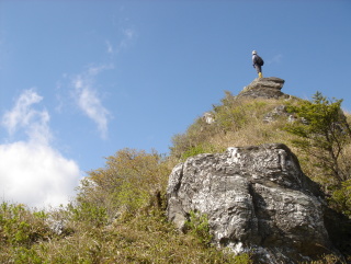 | 最後のピ−ク!前烏帽子から落ハゲへ向かう.... 一度下り、また登る。何度もニセピ−クに騙されながら やっと落ハゲ手前の鎖場まで戻って来た。 ここまで来ると落ハゲは目の前! 鎖場を登り、ちいさなヒ−クを過ぎると落ハゲ三角点に到着! お向かいのサガリハゲ山や矢筈山もバッチリ!素晴らしい眺めだ。 |