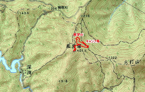 | 自宅-R193-脇町-R192-三加茂-桟敷峠-深淵-落合峠直前 桟敷峠-風呂塔キャンプ場-出発pm1:00-山頂(昼食)pm1:30 出発pm2:20-展望台pm2:35-キャンプ場pm3:00 歩行時間約2時間(休憩含む) |