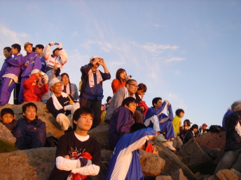 山頂到着!他の登山者と一緒に御来光の瞬間を待つ!