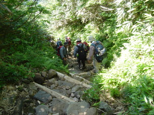 ▲登りには使いたくない険しい階段 ▲やっと別当出合登山センタ−が見えて来た!