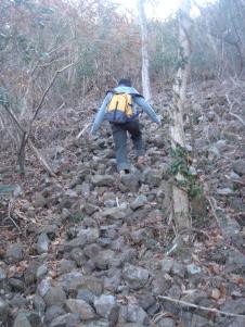 ゴロゴロの石の上を滑らないように登って行く...