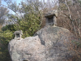 足元に気をつけながら降りて行くと、岩の上に小さな祠がある。