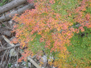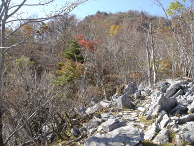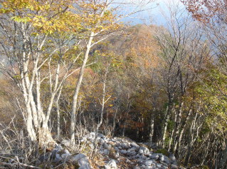 | 避難小屋を過ぎると、石立山のシンボル?石灰岩の岩場の道になって来た。 足元はゴツゴツして歩きにくいがこの辺りからの紅葉は素晴らしく何度も立ち止まって撮影♪ |