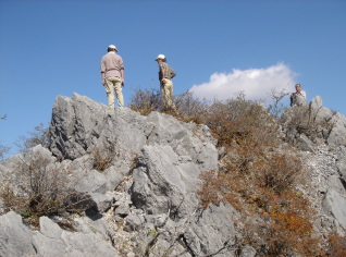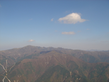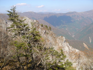 | 西峰到着後、まずは捨身ガ嶽へ向かう.... 岩場を慎重に歩き捨身ガ嶽へ到着!下を見ると....ぞぉ〜っ^^; だが眺めは素晴らしく、次郎笈方面の大パノラマが広がる。ス−パ−林道もクッキリ! 早く四駆を買ってス−パ−林道を走りた〜い! この素晴らしいパノラマ風景を見ながら昼食にする。標高1700mという事でセ−タ−を用意してきたが風も無く 丁度良い気温....気持ちいい(*^_^*) |