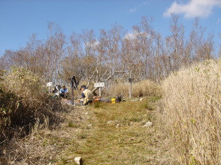 | 昼食後、すぐに山頂へ向かう.... 皆さんのHPによると笹藪がひどいと聞いていたが、キレイに刈り込まれており?歩きやすくなっていた。 (単に笹が枯れて歩きやすくなっているだけかも) 西峰から20分ほどで山頂へ到着! 山頂はちょっとした広場になっており皆さん思い思いに休憩されていた。 ここでお会いした方々に後ほど助けて頂く事になろうとは....(^^ゞ |