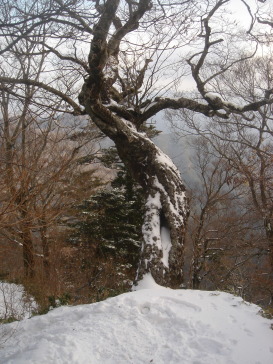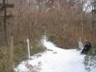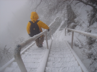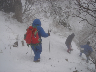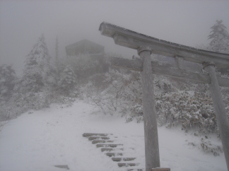 | 八丁坂を過ぎるとイヤという程の階段の連続(涙) このコ−スってこんなに階段ばかりだったっけ? 雪が積もっているので無雪期に比べるとマシかも知れないが とにかく階段は苦手〜 息を切らせながら登る(ーー;) 道中、何組かの方々にお会いする。 本日の挨拶は「こんにちは」じゃあなく「おめでとうございます」 前社ガ森にて小休止.... 前社ガ森を過ぎると傾斜がいくらかマシになり一安心.... 暗闇の中を黙々と歩く.... 夜明峠まで来ると少し白んできて少しずつ展望がきくようになった。 東の空を見ると、少し雲は出始めているがまだキレイな星空! 西条の町の灯りを眼下に眺めながら進む... 二の鎖小屋手前まで来ると、テントが数張り。 どうやらここで年を越された方々のようだ。私もいつかは泊まってみたい!! ここで私の工事現場風ヘッドライト(笑)が電池切れ! (登り始めに新品単三電池を4本入れたのに〜約三時間しかもたない事が判明!) 二の鎖小屋を過ぎるとだんだん雪が深くなってきたので慎重に歩く。 巻き道の鉄の階段の手すりを持つ手にもつい力が.... 山頂直前!雪をかぶった二の森・西の冠岳が一瞬見えた! が、アッという間に真っ白の世界に〜^^; 弥山到着! 淡い期待を抱き山頂で待機していた数十名の皆さんと共に am7:09の日の出の時間を待つ! 日の出の時間を過ぎたが晴れる気配まったく無し... あちらこちらから落胆の声〜 ジッとしていると風が吹き付け寒いので早々と下山する事に.... |