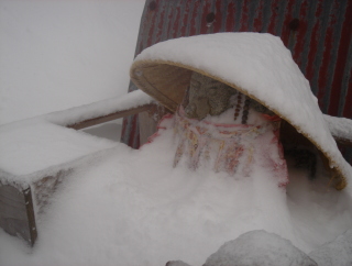 | 前社ガ森まで下りて来た! ここで昼食じゃあなく朝食...といっても相変わらずラ−メンですが(^^ゞ 食事をしていると少し晴れ間が見え出した.... 朝食後、出発! だいぶ雪の量が少なくなってきたがケガをするのもイヤなので アイゼンを付けたまま歩く。 |
