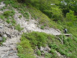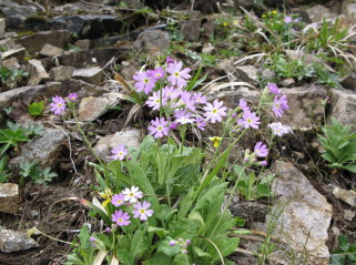 | 二の鎖小屋到着! 時間が遅いので立ったま少し休憩しすぐに出発です。 巻き道の階段の横のイワカガミはまだまだ硬い蕾.... 頭の中を不安がよぎります.... 本日のメインの場所へ向かう途中、皿ヶ嶺でお会いした方に再会! 「お花咲いてましたか?」と聞くと「全部咲いてましたよ!」との うれしい返事!心の中でガッツポ−ズ(^_^)v メインの場所に到着!咲いてるわ!咲いてるわ! 昼食もそこそこに大撮影会(笑)です。 皆さんよく御存知で次から次へとお花目的の方が集まってきます。 もしかして山頂へ行かれる人よりこっちへ来られる方の方が多いのでは.... そんな事は無い....(笑) |