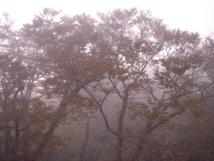 | 二日目、日の出が6時過ぎという事なので朝、5時半に目覚ましをセットし起床! 外へ出てみると生憎のガス^^;これからまた寝るのももったいないので朝食の時間まで山荘周辺を散歩したり ロビ−に置かれている山の本を見たりして過ごす.... 山荘裏側のブナ林に朝日が差してきた....なんともいえず幻想的です〜 朝食が終わる頃にはガスも取れ、きょうも雲ひとつ無い快晴♪ 山荘の管理人さんに御挨拶し、瓶ガ森へ向けて出発です。 約30分程で瓶ガ森登山口到着!やっぱり一泊すると゛楽゛ですね〜 |