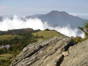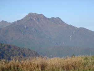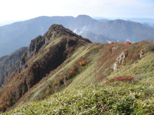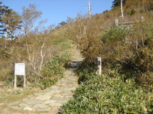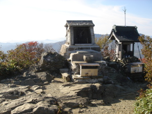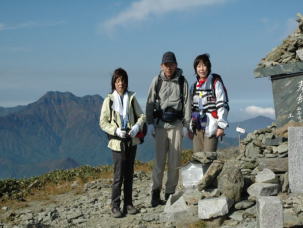 | 蔵王権現が祭られている男山山頂!到着....温度計を見ると12℃!少し肌寒いハズだ。 男山を後にし女山(瓶ガ森山頂)へ向かう....ここからはほとんどアップダウンの無い快適な道。 登山道に沢山のカメラマンの方がいらして思い思いに撮影されていた。 なるほど、ここからの石鎚山は素晴らしい〜 私も撮影ポイントを教えて頂き写してみる。やっぱり一眼レフ!欲しい〜 |