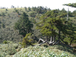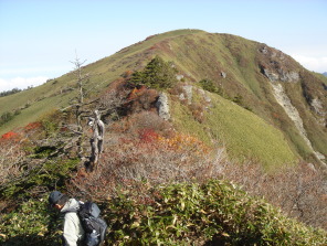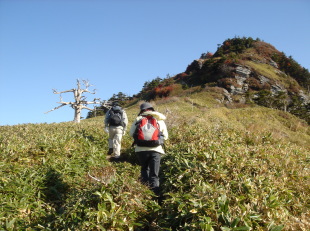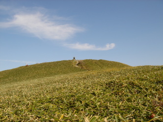 | 女山(瓶ガ森)山頂が見えて来た! 広い笹原に青空♪こんな風景、大好きです(*^_^*) 何も遮るものが無く360度の展望!昨日の男性的な石鎚に比べ今日は何もかも包んでくれそうな女性的な 瓶ガ森....2座セットで登って正解だったのかも知れません。 |