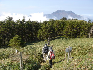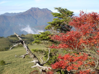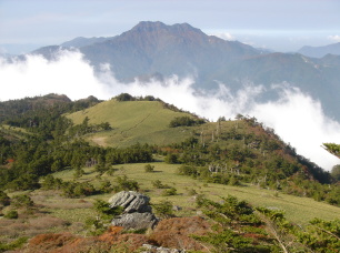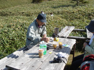 | 山頂を後にし、後はのんびりと笹原散策です..... 気持ちの良い笹原を石鎚山を眺めながらのんびりと歩きます。 だいぶ散策される方か増えてきました。途中テ−ブルがあったので、コ−ヒ−タイム♪ やっぱり自然の中で飲むコ−ヒ−はおいしいわぁ〜(*^_^*) |