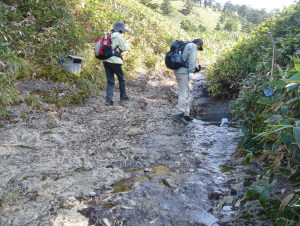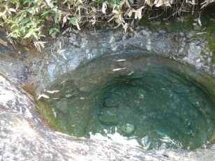 | ここまで来たのなら....と瓶壺へ行ってみる事にする。 途中、ポリタンクを抱えた方達にお会いする。ここの水は何にでも使えておいしいとの事... 私達も、手持ちのペットボトルに入れて持ち帰る事にした。 この水で作るコ−ヒ−や水割りはおいしいだろうなぁ〜 瓶壺の奥に見えた西之川への道....なかなか良い雰囲気だったので次回はこちらのコ−スを歩いてみたい! |