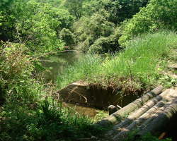 池の水はかなり濁っていた。池のまわりは緑の木々が生い茂っている。