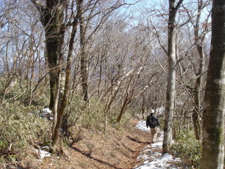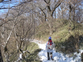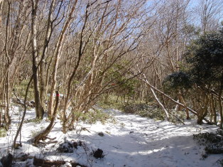 | 最初は薄暗い植林の中を歩く.... どうやらアイゼンは必要無さそうです。 15分程頑張ると自然林になり視界が開けてきた! 葉を落とした樹木の中アセビだけが、イキイキとした緑の葉っぱをつけていた。 |