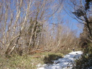 | ここを過ぎると、このコ−ス最大の難関?防火線を直登する。 結構、キツイです.....^^;でも登りはよかった..下りは〜 昨年はこの辺りから薄っすらと霧氷がついてましたが今年は無し〜 この雰囲気では霧氷は無理っぽい(ーー;) |