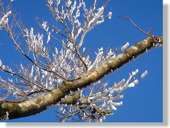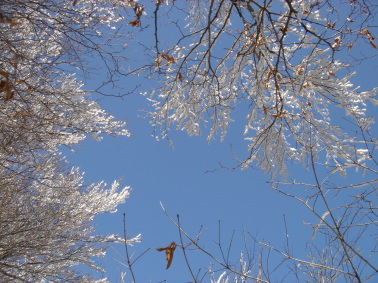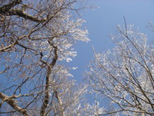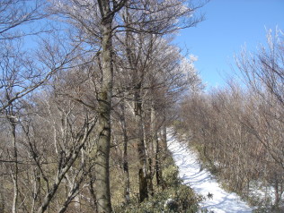 | 防火線の直登も終わり、ここからはブナ林が続く大好きな道だ♪ 青空の下、平坦な道を進む..... ふと前方を見ると....白い花?じゃあなく霧氷です♪ 諦めていただけにめちゃくちゃ嬉しい(^^♪ パシャパシャ写真を写します...ヘタな鉄砲も数打ちゃあ...(笑) 青い空に霧氷!やっぱり素晴らしいです!! 気温が高いのでキラキラ輝く霧氷がパラパラ降ってきます。 どうやらギリギリセ−フ!だったようです。 |