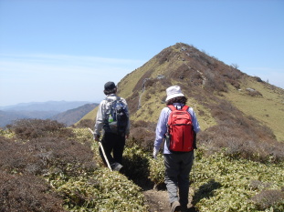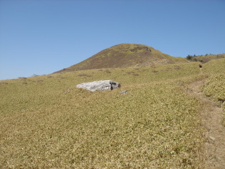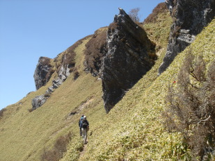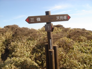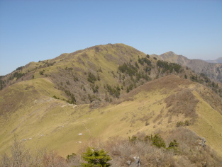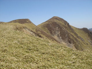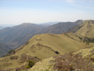 | 昼食後、体調もだいぶ回復しどうにか歩けそうです。 やっぱりここまで来たら天狗まで行かなくっちゃ! 軽いアップダウンを繰り返しながら笹原の中を気持ちよく歩く。 やっぱりこの道!いいわぁ〜 振り返ると三嶺があんなに遠くに見える。 |