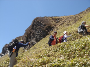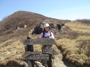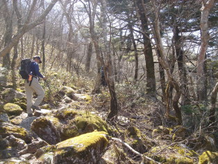 | 西熊山を後にし、お亀分岐へ降りて行きます。 お亀分岐まで降りて来ました。お亀岩の前で証拠写真を一枚♪ お亀分岐を過ぎると天狗峠を目指してキツイ登りの始まり.... 所々ロ−プがかけて有り、ロ−プを利用し頑張って登ります。 |