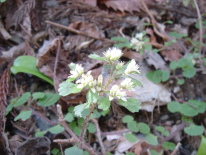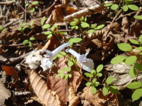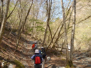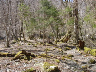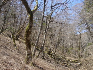 | 林道を歩く事数分で紫雲さんから教えて頂いた 林道ショ−トカットコ−ス?が見えて来た。 ショ−トカットコ−スをしばらく歩き再度林道へ出る。 すぐに平尾谷登山口到着。 さぁここから本日の縦走出発口だ! いきなりの急登を登って行く.....気温が高くすぐに汗ダク。 この辺りから目の前に星がチラツキ出し貧血状態〜ナンテか弱い私(殴) とても皆さんのペ−スに付いて行けません^^; 先に行って頂きしばらく座って休憩。 こんな体調じゃあせいぜい三嶺までしか行けそうにないなぁ〜 (しっかり三嶺までは行くつもりの私) 名頃へ下山し皆さんを待つ事にしようかなぁ〜不安が頭をよぎります。 しばらく休むと少しずつ回復してきたので、ゆっくりペ−スで進んでみます。 目の前にステキなブナ林が見えてたので少し元気回復! |