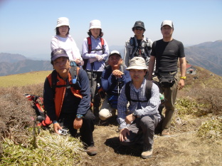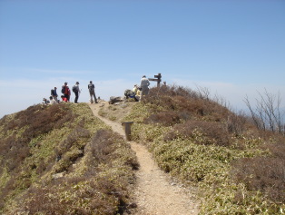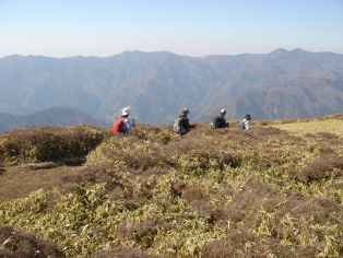 | ここまで来ると山頂は目の前.... 足どりも軽くなります。 12時過ぎ三嶺山頂1893m到着! 何も遮るものが無く360度の展望です♪この景色を見ると疲れも吹っ飛びます。 ここで皆でワイワイ昼食タイム。 実はこれが楽しみだったりして(^^ゞ |