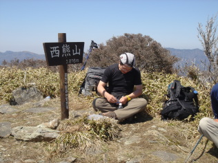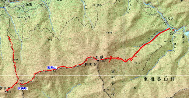 | 自宅-R193-脇町-貞光-名頃駐車場am8:30-出発am9:10 平尾谷登山口am9:30ダケモミの丘am10:50-マユミの木(たぬきのかんざし)am11:20 三嶺山頂(昼食)pm12:10出発pm12:40-西熊山山頂pm1:40-お亀岩pm2:20 天狗峠(小休止)pm2:50-天狗塚山頂pm3:15天狗峠pm4:00 1476m地点pm4:35-西山林道登山口pm5:10 歩行時間約8時間(休憩含む) |