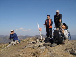 | 歩き始めて約7時間!ラスト天狗塚山頂1812m到着! 今日歩いた稜線を見ながらなんとか歩けるものだと感動! (皆様に多大な御迷惑をお掛けしましたが) 天狗峠まで戻り、下山です。 後は下りるだけなので楽勝!のハズですが意外に急勾配なので 疲れた足に堪えます.....こんなに急勾配だったっけ^^; |