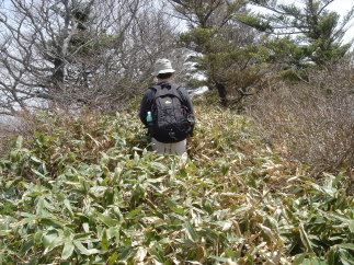 ▲一ノ谷分岐(間違えないように笹の中を進む) ▲刈り込まれていない笹の中を進む