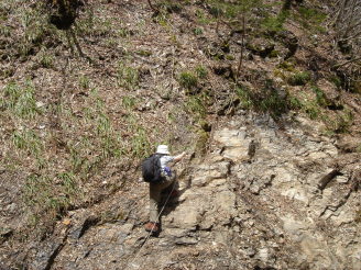 ▲ここも大きく崩れているが上に迂回路 ▲清家先生の説明を聞く
