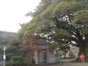 ▲JR財田駅と樹齢700年のタブノキ ▲四国のみち道標