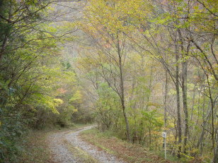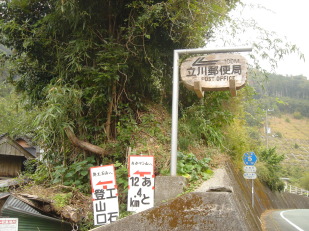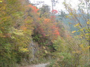 | 立川番所の手前に木製で出来た立川郵便局の案内板がある。 ここから町道仁尾ヶ内線へ入る。しばらく走ると舗装が途切れ、オフロ−ド道の始まり始まり.... 林道沿いの紅葉は素晴らしいが運転に必死で景色を楽しむ余裕が無い! 底をすらないように、ゆっくりゆっくり走る。それでも何度かガリガリ(ーー;) 約1時間弱で奥工石山登山口へ到着!やっぱり四駆欲しいよぉ〜 |