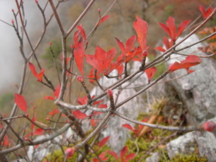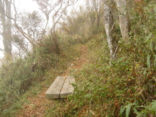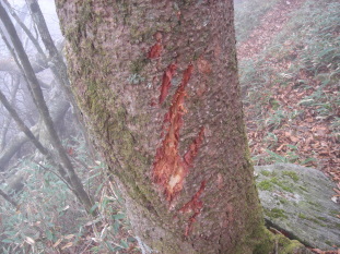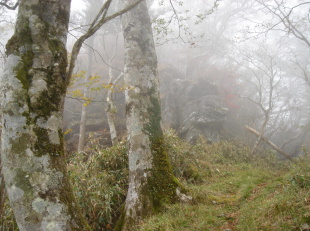 | 岩清水を過ぎ、しばらく歩くと熊の爪とぎ?痕のような深いキズを発見! よく見るとまだ新しいキズだ。まさか熊じゃあないですよね(怖)少しビビりながら先を進む。 山頂はもうすぐ...紅葉に彩られたブナ林を進むと目の前に大きな岩場! 岩場の横を巻き最後の急登を登り切り、左へ進むと祠のあるピ−ク!右へ進むと一等三角点がある山頂だ。 まずは祠のある岩場のピ−クへ行く。あまり広くないので団体さんはちょっと無理かも... 晴れてればきっと素晴らしい展望なんだろうけど今日はガスの為、残念〜 それでも下を覗き込むと足がすくむ^^; 高知から来られたグル−プの方が三角点のあるピ−クへ行かれたので、ここで先に食事にする。 多分、場所を譲ってくれたのだと思います。ありがとうございました。 じっとしていると寒いのでセ−タ−を着込む。もう暖かいラ−メンがおいしい季節ですね(*^_^*) |