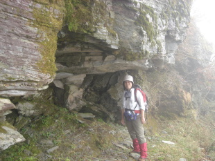 | 苔むす岩場を登り切ると尾根道に出た! ここからは緩やかな登り...ベンチが設置されている場所に着いた。 晴れてれば展望が素晴らしいのだろうが今日は生憎のガスで真っ白(涙) ここからは山名の由来である岩場の連続!だが登山道は岩場を巻くようになっており 厳しい危険な場所は殆ど無いので御安心を.... 岩清水(この日は残念ながら水は出ていませんでした。)の手前には雨宿りにピッタリの大きな岩場! なんせでっかい! |