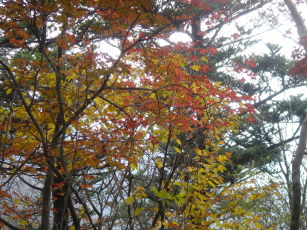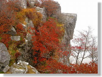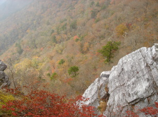 | 昼食後、高知から来られた方と入替えに三角点があるピ−クへ移動する。 約5分ほどで三角点があるピ−クに到着。樹木が茂っており展望は殆ど無い.... こちらもあまり広くないので団体さんは少し困るかも知れません。 午後からガスが晴れてきて周辺の展望がハッキリしてきた。 紅葉のピ−クは少し過ぎたもののまだまだ美しい〜 もう一度、祠があるピ−クへ行き下を眺める♪素晴らしい展望だ!! |