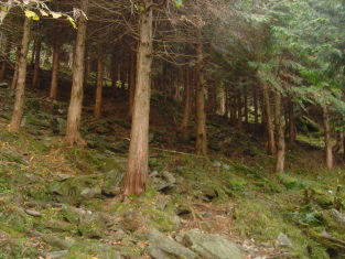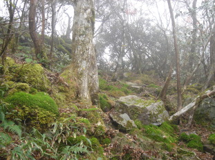 | 登山口である工石山荘周辺は広場になっており駐車場の心配は無い。 準備をしているとポツリポツリ雨〜(ーー;) カッパを着るほどでもないのでとりあえずスパッツのみ付け、出発!! 最初は薄暗い植林帯の中を進む。結構、急登で息が切れる.... 植林帯を抜けると、視界が開け苔むす岩場にブナの木! いいなぁ〜こんな風景、大好きです。 |