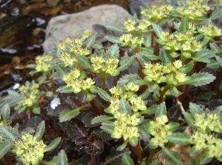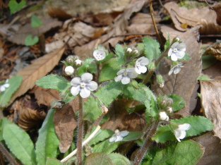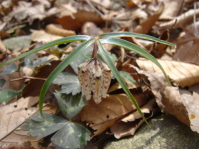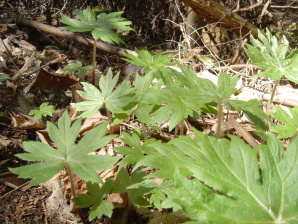 | よく整備されたトラバ−ス道を歩く.... 昨年、崩れかけてた場所も手直しされ歩く良くなっていた。 早速、ハシリドコロの群生...他にも色々な芽が出ていたが花はまだ先のよう... お目当てのニリンソウ群生地?も残念ながら葉っぱのみ^^; 快適なトラバ−ス道散歩も終わり、山頂手前の県道へ出た。 |
