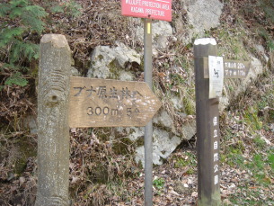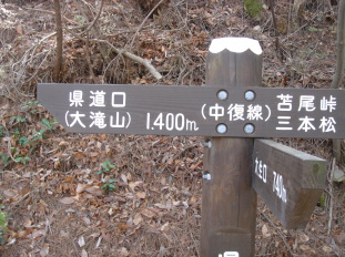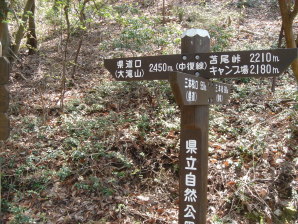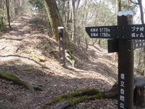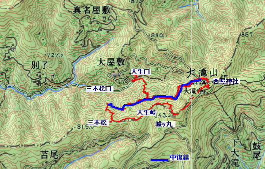 | 大生口am10:00-中復線am10:20-大滝山山頂am11:40-西照神社(昼食)am11:45 出発pm12:25-ブナ峠-ブナ林-城ヶ丸pm12:45-大生峠pm12:55 三本松pm1:10-中復線pm1:30-大生口との分岐pm2:00-大生口pm2:15 歩行時間約4時間(休憩含む) |