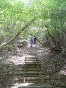 山頂までの木の階段...キツイ!休み休み登る。