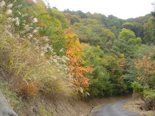 ▲また車道だけどススキと紅葉の組合せが美しい ▲竜王峠