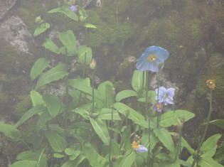 | 風穴駐車場へ到着! こちらにも沢山の車が駐車中〜 まずは風穴へ行く。冷気が漂ってきて涼しい〜温度計を見ると4℃! 名物?の青いケシはもう終盤なのか台風で傷んだのか殆ど花は散っていた。 |