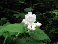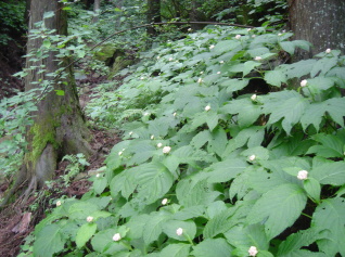 | 充分涼んだ後、竜神平を目指す.... 登山道沿いにはギンバイソウの群生が目を楽しませてくれる。 ぷっくりしたピンクの蕾がカワイイ! 台風の翌日という事もあり登山道のいたるところで水が流れているが 歩くのには問題が無い。 すっかり深緑になった木々の横を快適に歩く。 |