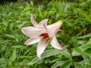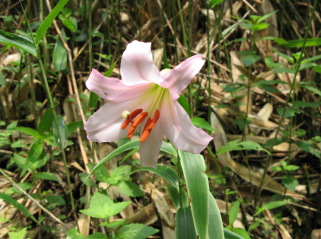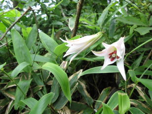 | ハンカイソウを楽しんだ後、愛大小屋の左側から山頂を目指す.... ステキなブナ林の中を登る事、約30分弱で皿ヶ嶺山頂到着! 残念ながら展望はイマイチ! 約10名程の先客が思い思いに休憩されていた。 さすが人気の山だなぁ〜私たちもここで昼食にする。 昼食後、引地山方面へ進む....赤いヤマツツジが満開〜 登山道沿いのササユリが美しい〜 時間があれば引地山も....と思っていたが遠くから雷の音! 怖くなり早々に下山する事にした。 下山中もどんどん下から沢山の方が登って来られていた。 雷...怖くないのかなぁ〜 PM2:00水の元登山口まで戻って来ると 雷の音はいつの間にか聞こえなくなっていた。 それならば時間もある事なので白猪の滝へ向かう事にした。 |