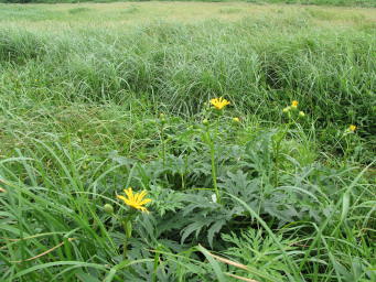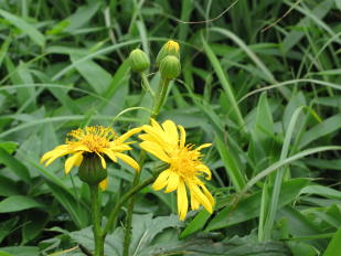 | 上林峠との分岐に到着! ここで早くもササユリ発見!台風にも負けず清楚な姿を見せてくれました(*^_^*) 時間があるので上林峠方面から周遊する事にする。 ステキな森の中をのんびりと歩く.... 30分弱で見晴らしのよい竜神平へ飛び出た! 前回、訪れた時はガスで何も見えなかったが今日は少し曇っているもののバッチリ! お目当てのハンカイソウが緑の中、鮮やかな黄色がひときわ目立っていた。 まだ咲き始めなのか蕾を沢山つけている。 しばし撮影タイム(笑) |