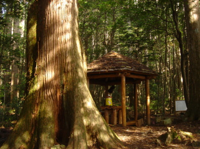 ▲傘杉堂(東屋の中の黄色の筒は森へのメッセ−ジポスト)