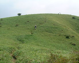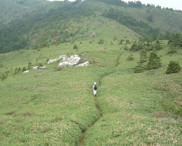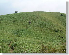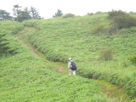 ▲広大な笹原を歩く ▲登山口へ降りて来た