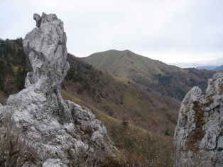 | 剣山ヒュッテの横を通り山頂到着! 悪天候にもかかわらず意外と登山者が多い....さすが日本100名山! 雪が無くガッカリしていると、今日は伯耆大山が見えますよ!と教えて頂いた。 急に元気が出て(げんきんなモノです)大山の方向を眺める..... 確かに、見えました〜!感動!! この日、四国は曇り空でしたが中国地方は晴れてたのか幸運にも望む事が出来ました! やっぱり自然って不思議です。 勿論、三嶺方面一の森方面の展望もいつもより鮮明です。 |